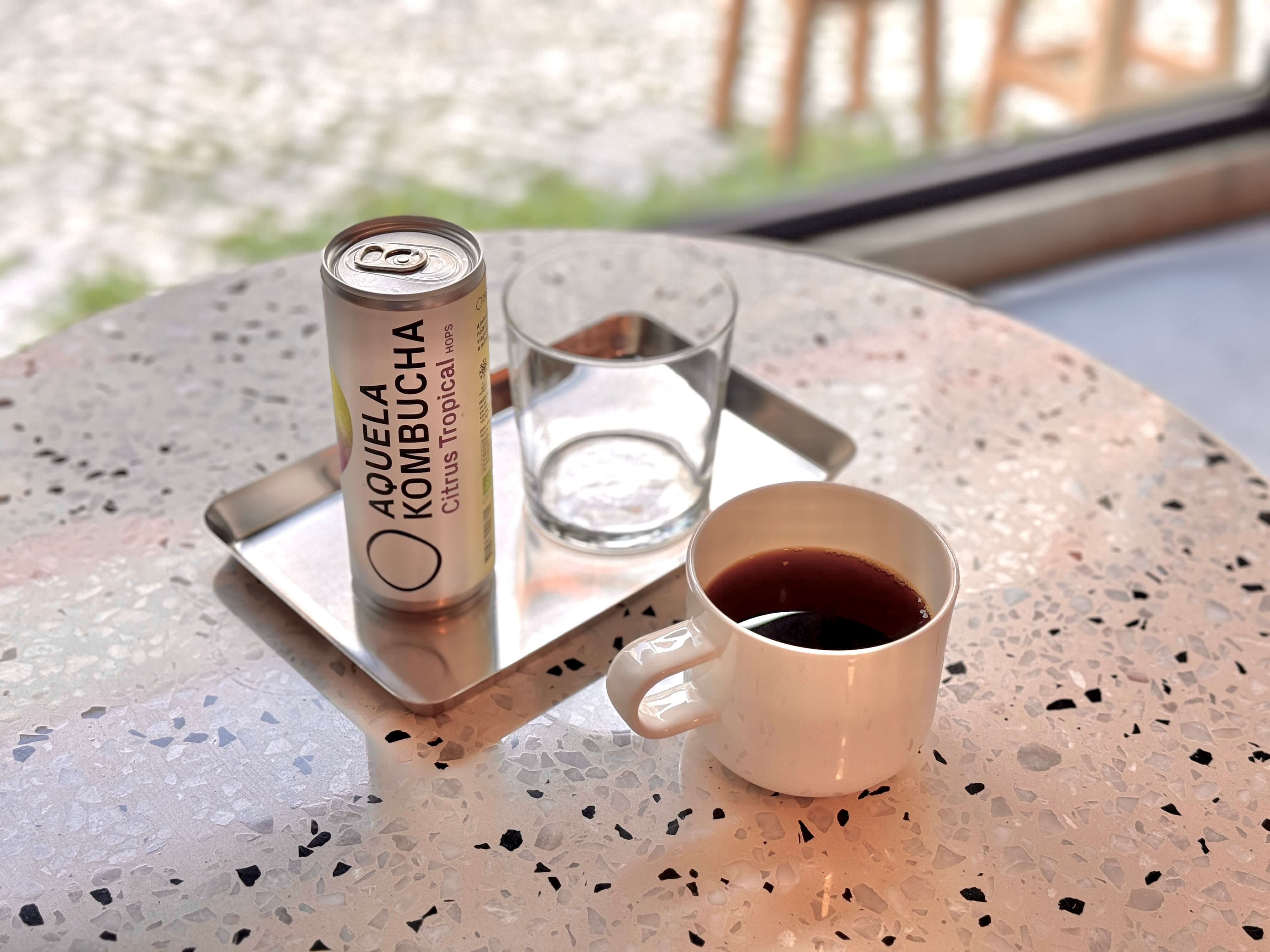 The cute café and micro roastery is on a steep road in Pena and is so inconspicuous that you might miss it. There is a large floor to ceiling window painted in dark pine green next to double doors leading inside. The interior has industial elements with poured concrete floors, a bar made of modular metal elements and partially exposed ceilings.