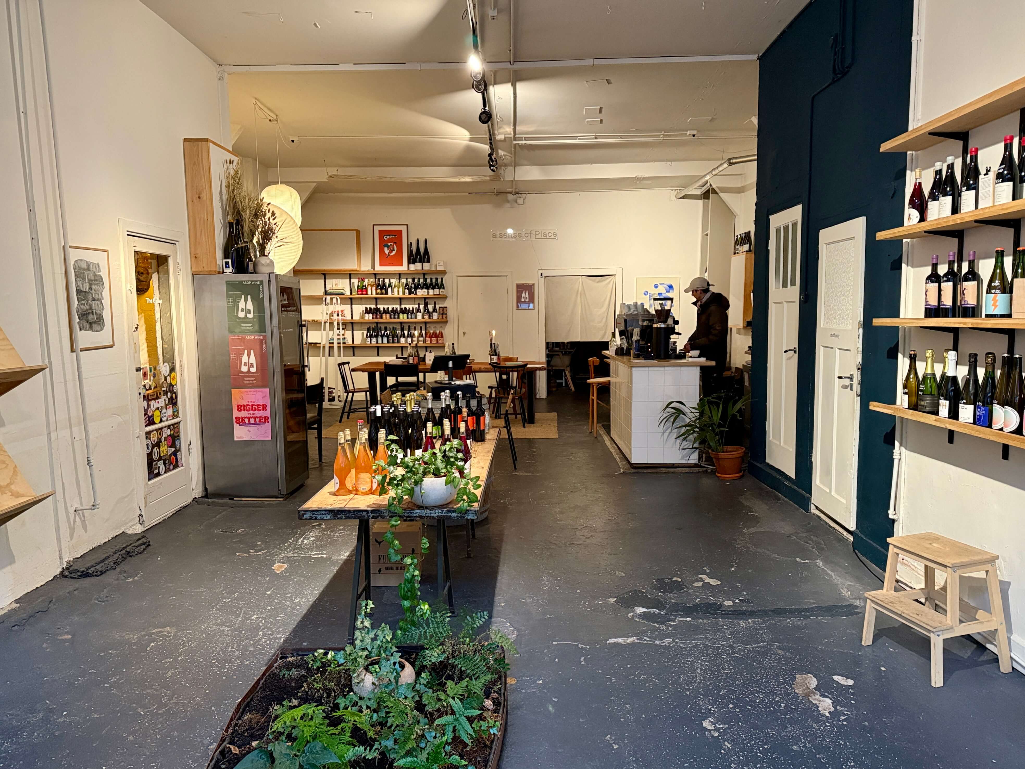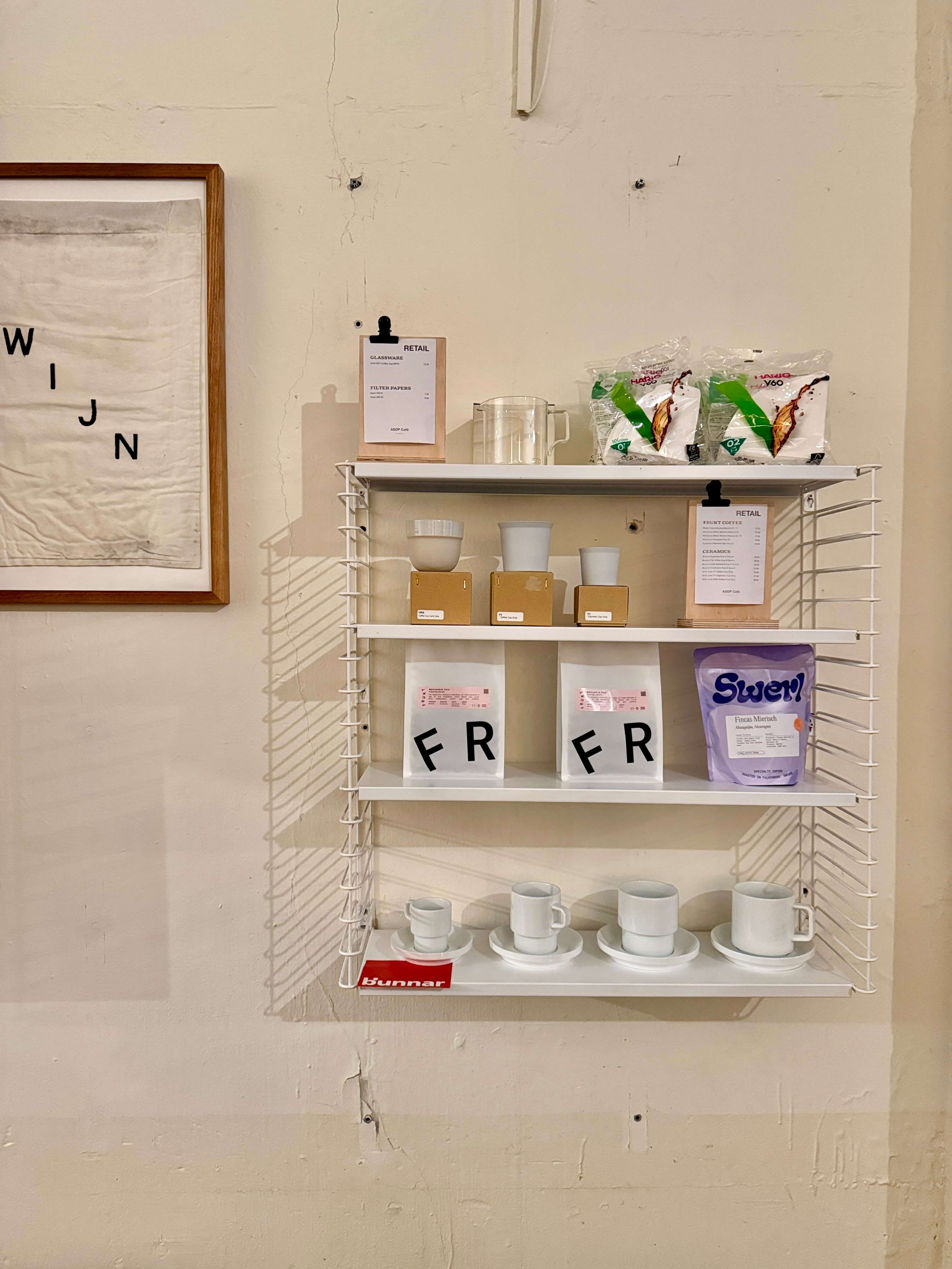 There is a large communal table and some individual tables. Wine bottles decorate the walls all around. Luckily, there are also a few non-alcoholic options. At the time of my visit, ASOP Café was serving Frukt Coffee and had some bags of Swerl Coffee left on the retail shelf. Lucas told me that he aims to change his roasting partner every quarter and maybe come summer, he will also offer an additional guest roaster.