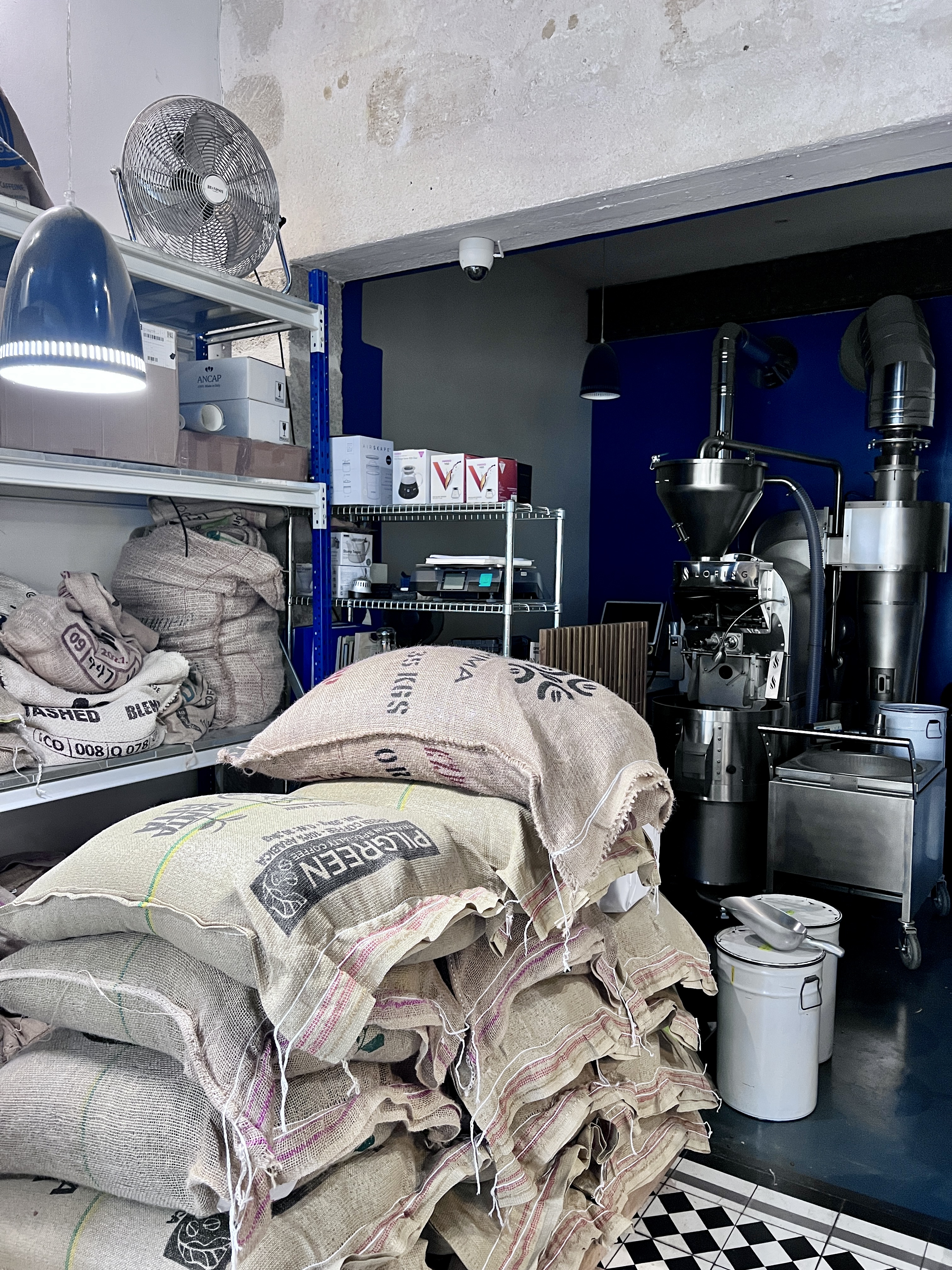 It’s located on a short stretch of the Rue Notre Dame close to many other favourites of ours. These include Restaurant Pickles where we had an excellent dinner the night before and the Fire Walk bar where we went for a night cap after. La Pelle is a local roaster that, like L’alchemiste uses a modern Loring roaster, which is probably why it is allowed to operate in such a busy residential quarter. The Loring roaster massively elimiates any gases and odours that are created during the roasting process.